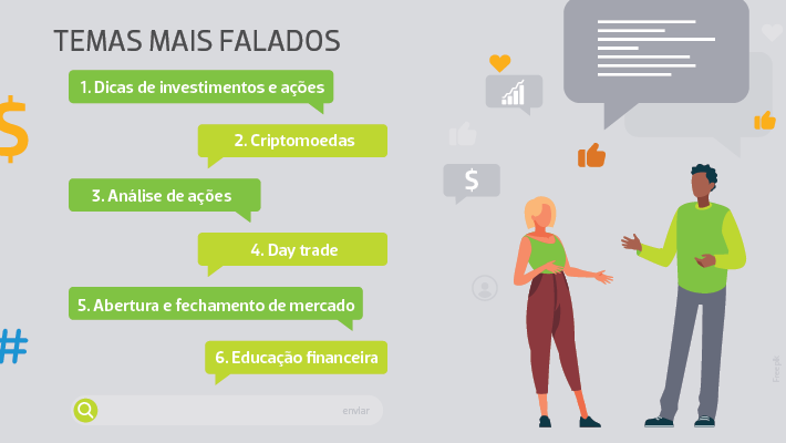 Utilizando o YouTube como base, foram identificadas as seis temáticas mais abordadas. Cada uma possui estilos de publicações frequentes – como as transmissões ao vivo de operações de day trade, ou os posts “passo a passo” de educação financeira.