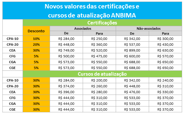 A redução de valores (entre inscrições e atualizações de certificados), que varia de 5% a 30%, não é uma ação promocional ou temporária. O valor para realizar a prova da certificação CPA-10 - considerada uma porta de entrada importante para quem busca dar os primeiros passos na área financeira -, por exemplo, passou de R$ 284,00 (para profissionais que trabalham em instituições associadas à ANBIMA) e R$ 342,00 (para quem não trabalha em instituições associadas) para R$ 250,00 e R$ 300,00, respectivamente. Já para a CEA (Certificação ANBIMA de Especialistas em Investimento, que habilita profissionais a recomendar produtos de investimentos para diversos segmentos e assessorar gerentes de contas), o custo de realização do exame caiu de R$ 749,00 (associados) e R$ 899,00 (não-associados) para R$ 520,00 e R$ 630,00, respectivamente. Veja abaixo a tabela completa.