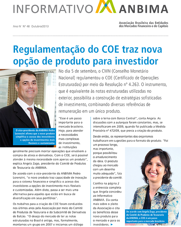No dia 5 de setembro, o CMN (Conselho Monetário Nacional) regulamentou o COE (Certificado de Operações Estruturadas) por meio da Resolução nº 4.263. O instrumento, que é equivalente às notas estruturadas utilizadas no exterior, possibilita a construção de estratégias sofisticadas de investimento, combinando diversas referências de remuneração em um único produto