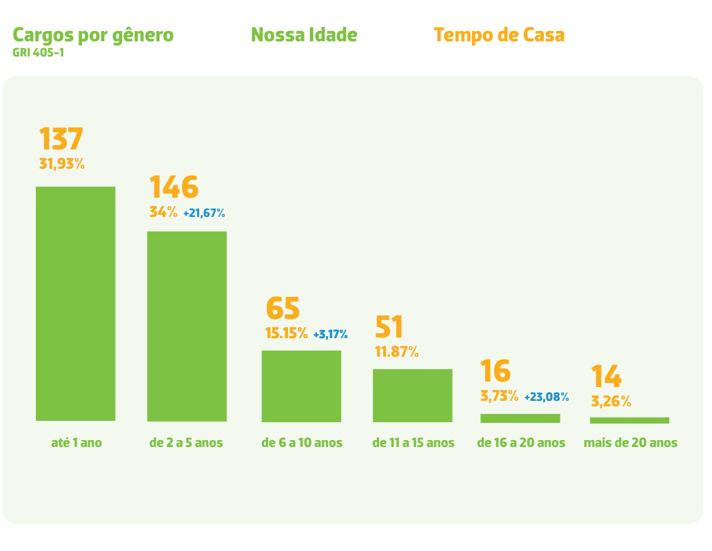 GRI 2-7, 401-1, 405-1Temos trabalhado para alcançar a meta de termos 52% do time formado por pessoas pretas e pardas até 2025, com equilíbrio na presença de homens e mulheres na equipe. A cada ano, ficamos mais perto do objetivo: encerramos 2023 com um quadro composto por 37% de pessoas pretas e pardas e 45,22% de mulheres em nosso quadro de colaboradores.